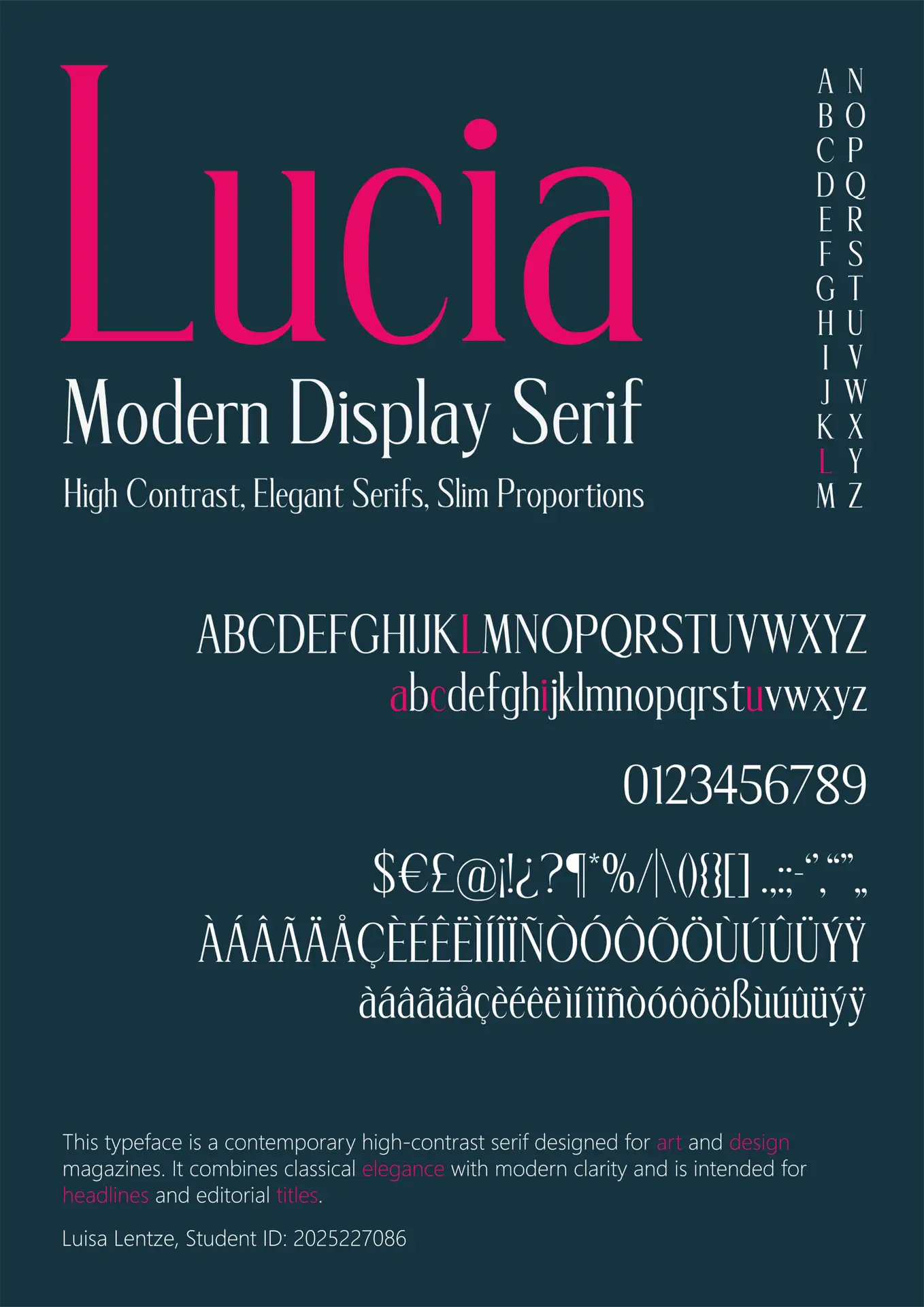 This typeface Lucia was created in a Typography class of Ricardo Santos at ESAD in Caldas da Raihna, Portugal. Lucia is a contemporary high-contrast serif, designed for art and design magazines. It combines classical elegance with modern clarity and is intended for headlines and editorial titles. The font is used in all headlines on this webpage.